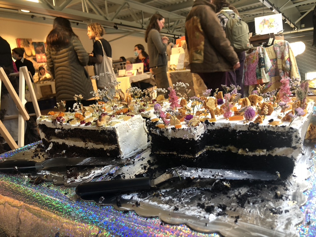 SLAB 1 chocolate miso cake with blood orange curd in the middle, cardamom brown butter italian buttercream, salty rose honeycomb candy, more curd, nice flowers