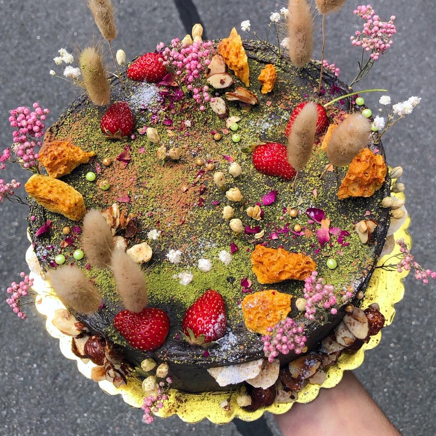 i had a lot of fun with this one ◡̈ GF chocolate miso cake, salty honey cardamom pastry cream in the middle, dark chocolate kahlua buttercream, salty rosy honeycomb, ginger, berries, salty honey hazelnuts and almonds, matcha pistachio moss, sparkles, rose, jasmine, nice flowers