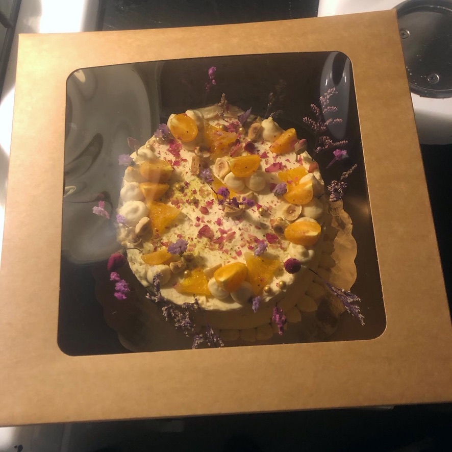 GF dark chocolate miso cake, blood orange curd in the middle, choco hazelnut cream, salty orange buttercream, golden berries, candy orange, hazelnuts, nice flowers, gold.