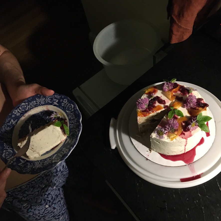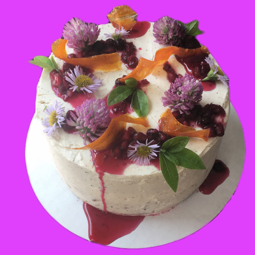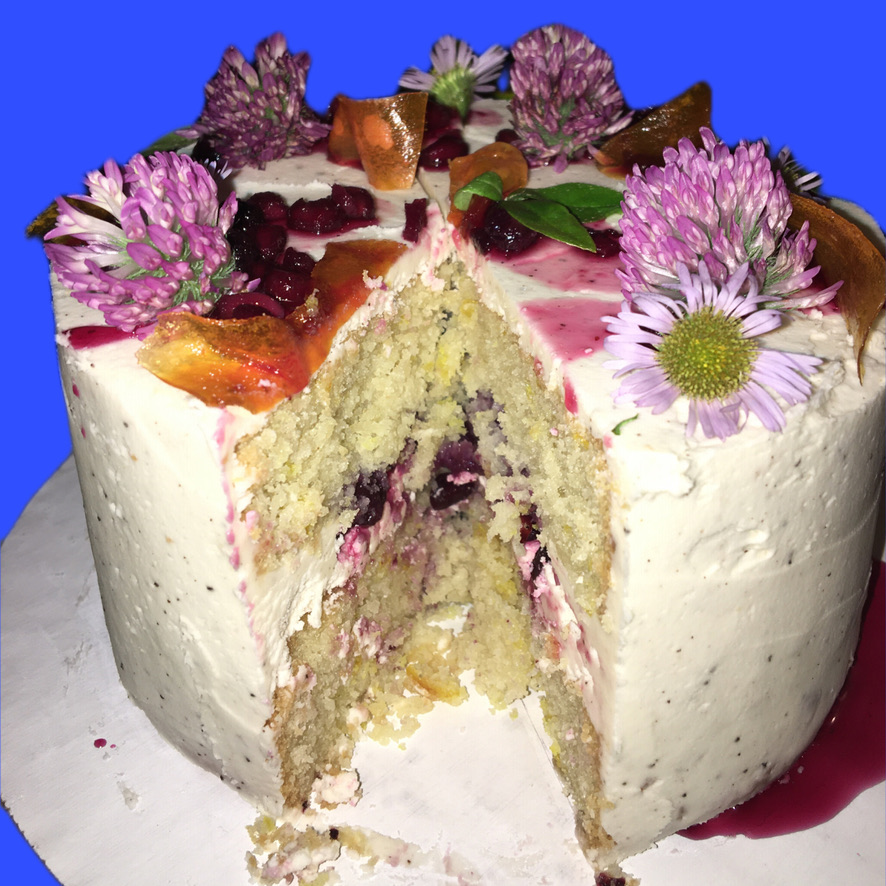 lemon almond sponge, lemon brown butter buttercream, ginger blueberry pomegranate compote, pom syrup drizzle, candy carrots, clovers :)