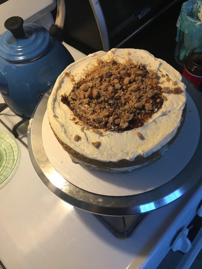 3 stack vegan earl grey cake, orange olive oil cake in the middle, citrus vegan cream cheese frosting, vegan spice cookie crumbles & fig jam in the middle. pomelo, figs, blackberries