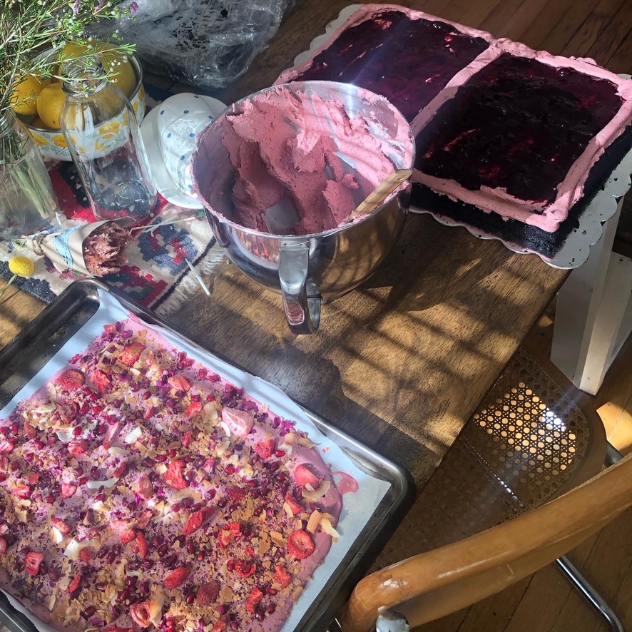 big bIG dark chocolate miso cake, berry rose jam and blackberries in the middle, tangy berry pomegranate swiss merengue buttercream, ruby bark with pom gems, strawbs, toasted coconut, rose, feuilletine, and malden, blackberries, gold, nice flowers :)
