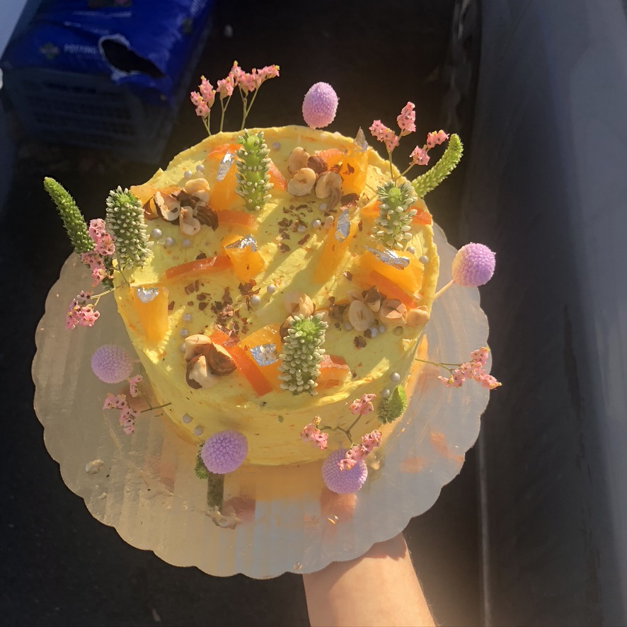 all vegan ꯱pค¢ē f໐rē꯱t dark chocolate miso cake, hazelnut crunch and orange syrup in the middle, tangy turmeric orange buttercream, toasted hazelnuts, candy orange, fresh orange, malden, silver, nice flowers